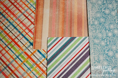 Which one throws you for a loop (no fair saying "all of them!")? Believe it or not, the one that threw me off the most was the last one I picked....the top center pastel colored stripes! The other three I chose all had the same color intensities to work with, but the taupe and pink pastel stripes, in my eyes, DOES NOT GO with any of the other pieces. It was the hardest to incorporate into the design.
